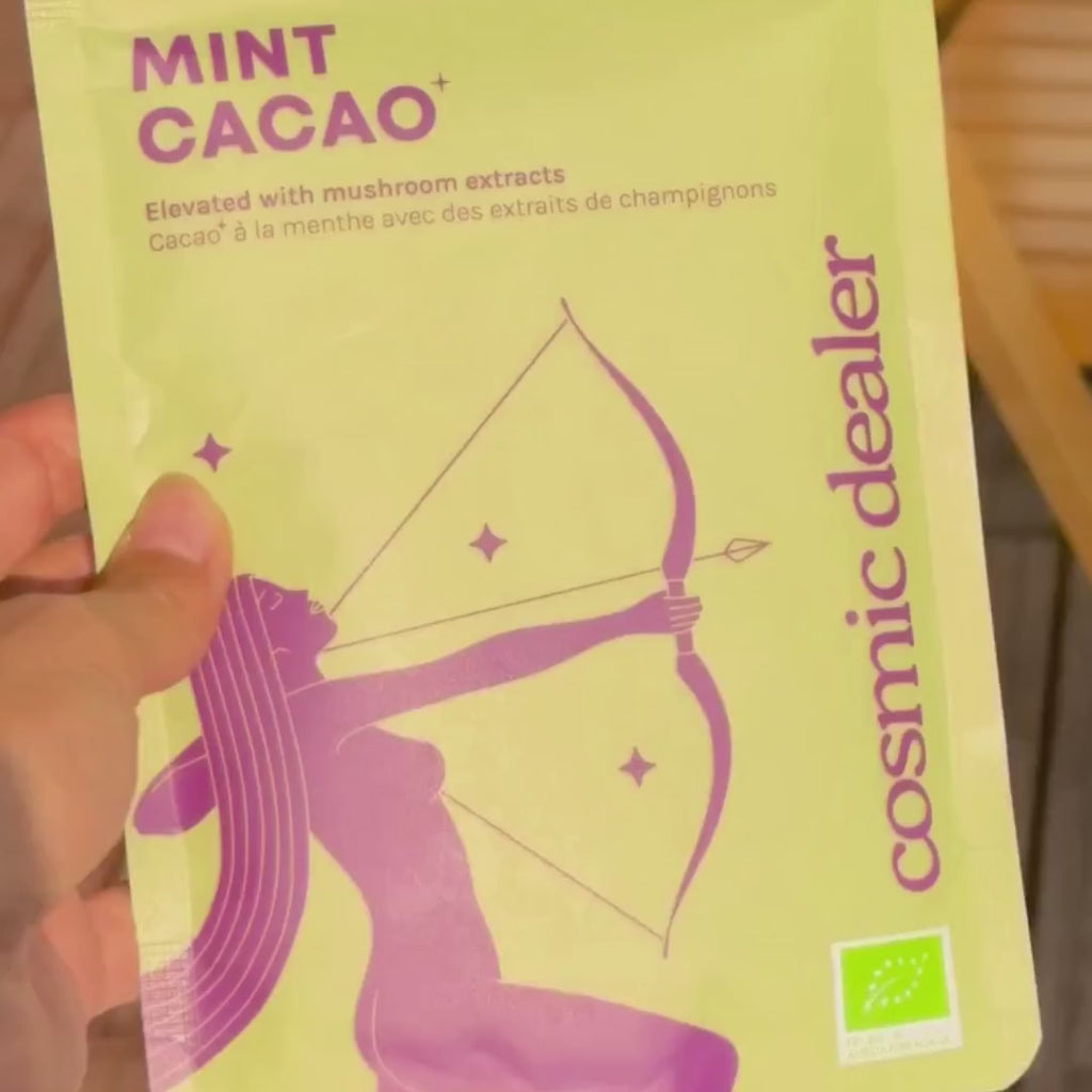 Cette version Cacao Menthe, offre un mélange chocolaté et onctueux à base de fèves de cacao, enrichi des extraits de champignons, menthe rafraîchissante et lucuma pour une touche de caramel.